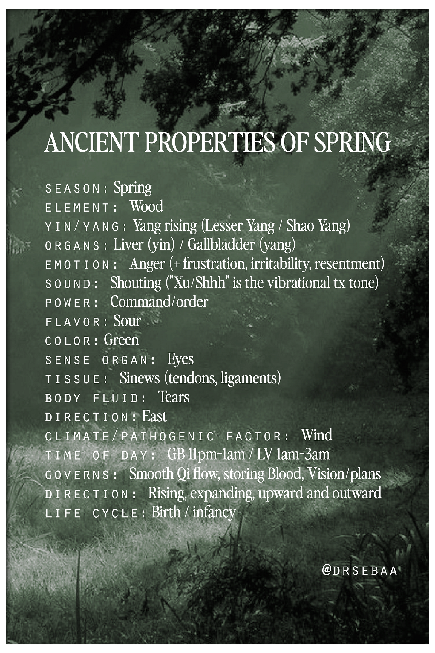 An important note for my ladies, especially those with anemia: the Liver stores Blood and opens to the eyes. Excessive screen time and blue light exposure strain the eyes, which draws on Liver Blood. If you are already dealing with Blood deficiency (Xue Xu) (think: from heavy menstruation, postpartum depletion, gum disease, or poor nutrition) your eyes are more vulnerable. You might experience: Dry eyes, blurry vision, floaters, dizziness, and light sensitivity. The screen use compounds what is already depleted. This is one of the most common patterns I see in women, and spring is when it tends to flare because the Liver is being asked to do more with less. Nourishing Liver Blood through diet (dark leafy greens, bone broth, black sesame, goji berries, organ meats, etc) and reducing eye strain become even more essential this season.