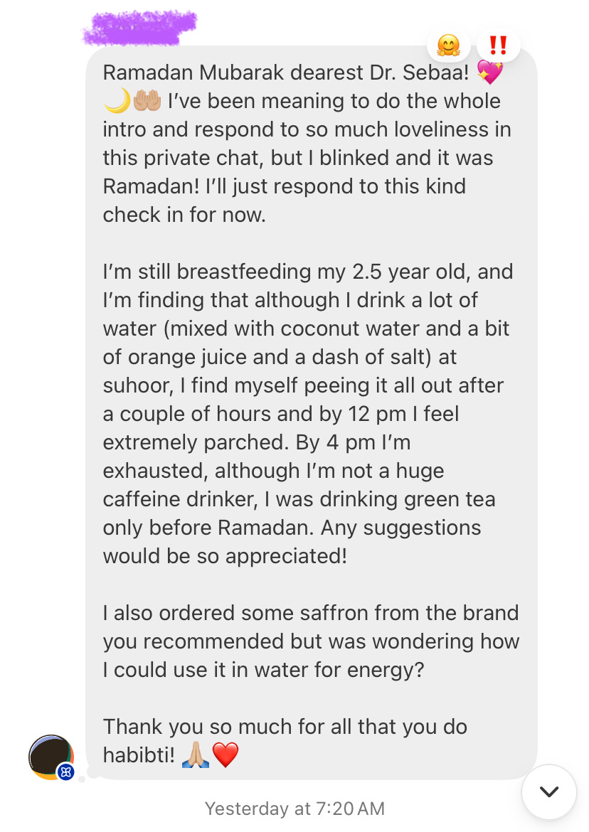 From a TCM and functional lens: what you’re describing by noon is an acute yin depletion pattern that emerges from situational demand, not necessarily underlying constitutional deficiency. Dry fasting depletes. Breastfeeding a toddler depletes continuously, pulling fluid directly into milk production. ^Two yin-consuming forces running at once. The parched mouth, the 4pm exhaustion that feels like your reserves are being drawn on is your body saying something. This is normal Ramadan physiology amplified by lactation, and naming it accurately matters, because it changes how we respond to it.