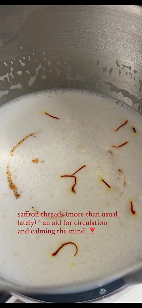 A necessary note for nursing mamas: stick to 3-5 threads max. Culinary amounts. Saffron at high doses (we’re talking upwards of 5 grams daily, far beyond what you’d use in food) carries risk of uterine stimulation. At normal culinary use, this is well within safety. For true milk supply support, fenugreek, oats, nettle, and moringa have stronger evidence as galactagogues and are great at suhoor. Saffron supports you ~ the mood and circulation and warmth of the body doing the work. That matters enormously for a nursing mama fasting through Ramadan. Just keep it to a few threads.